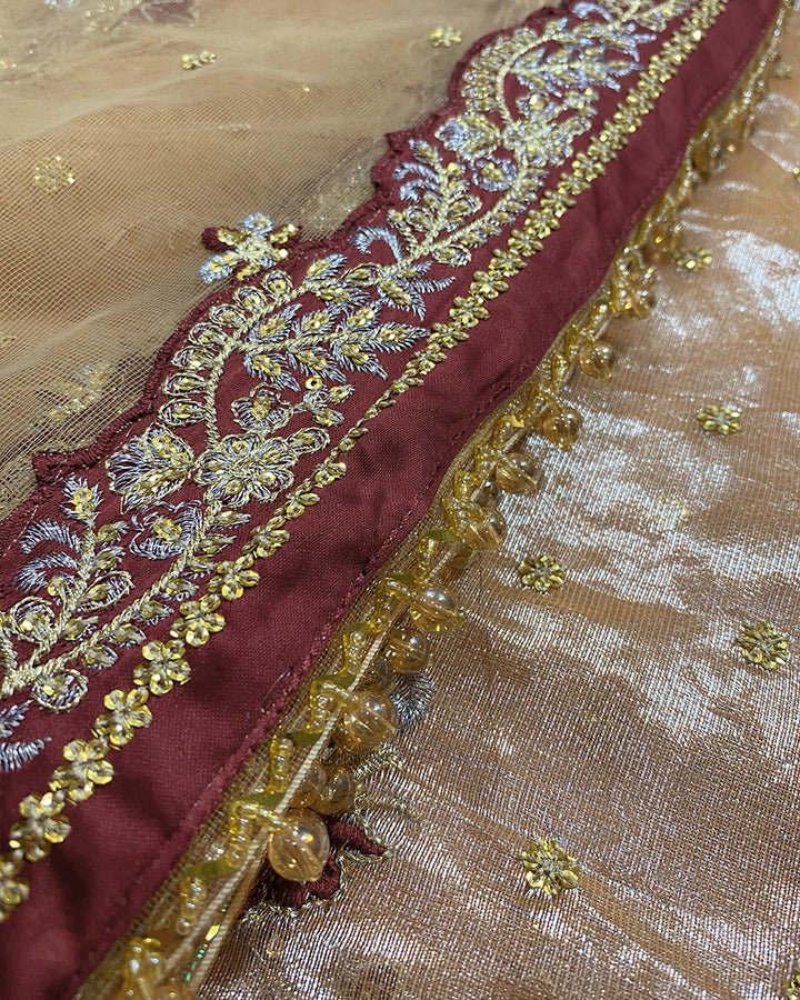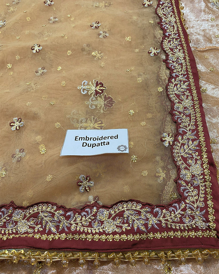 Net dupatta with 4-sided embroidered borders and hand embellishments