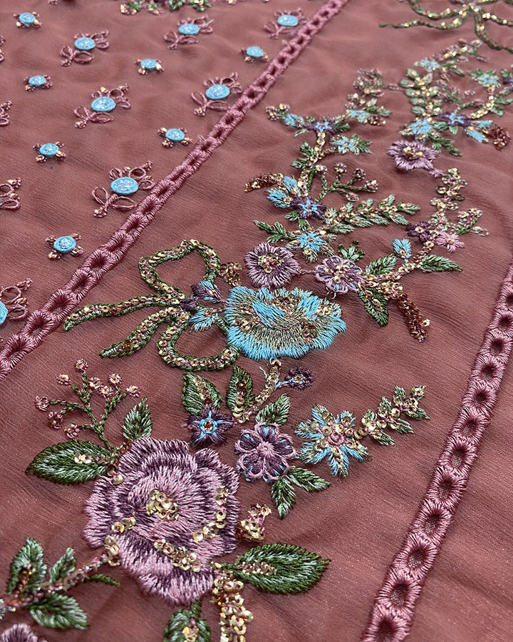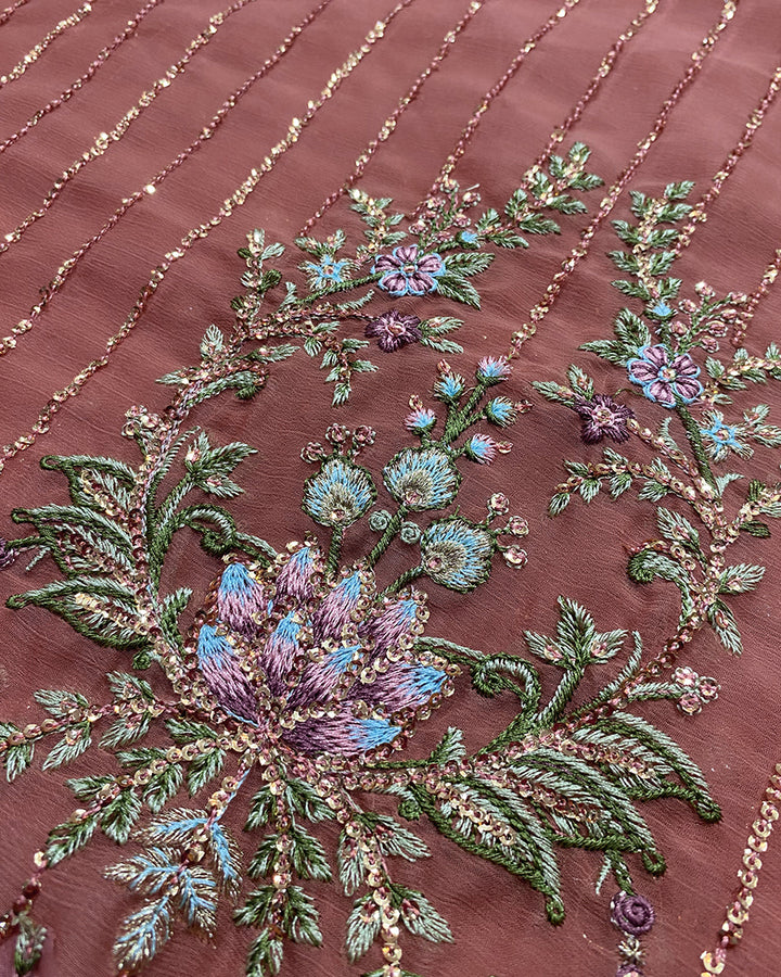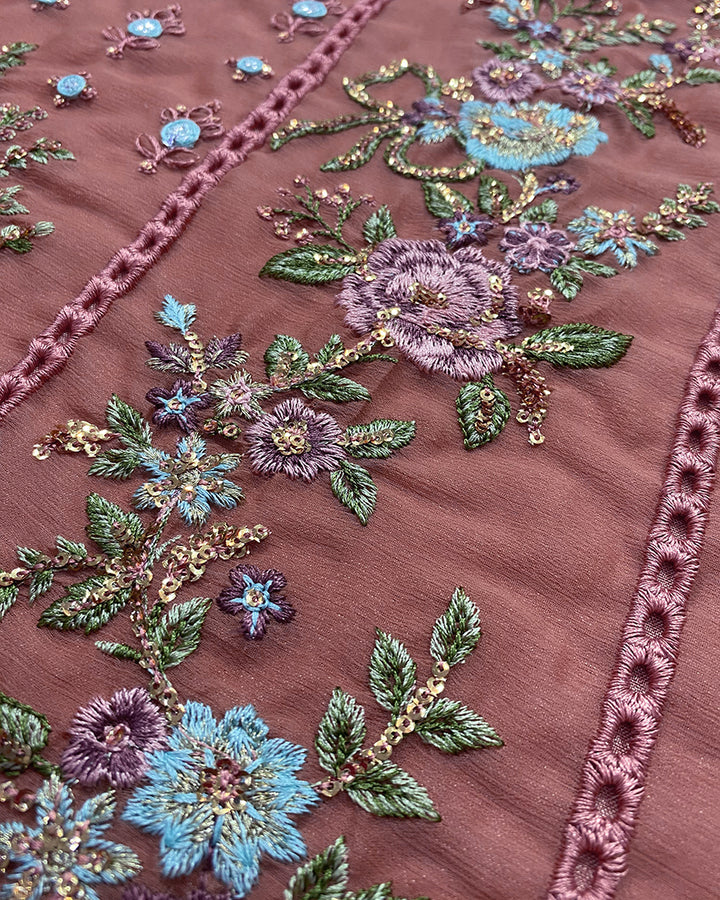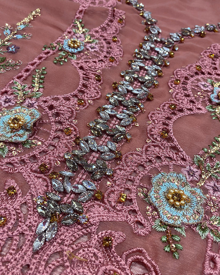 Intricately embroidered and hand-embellished Adda work front featuring 3D flowers and elegant cutwork
